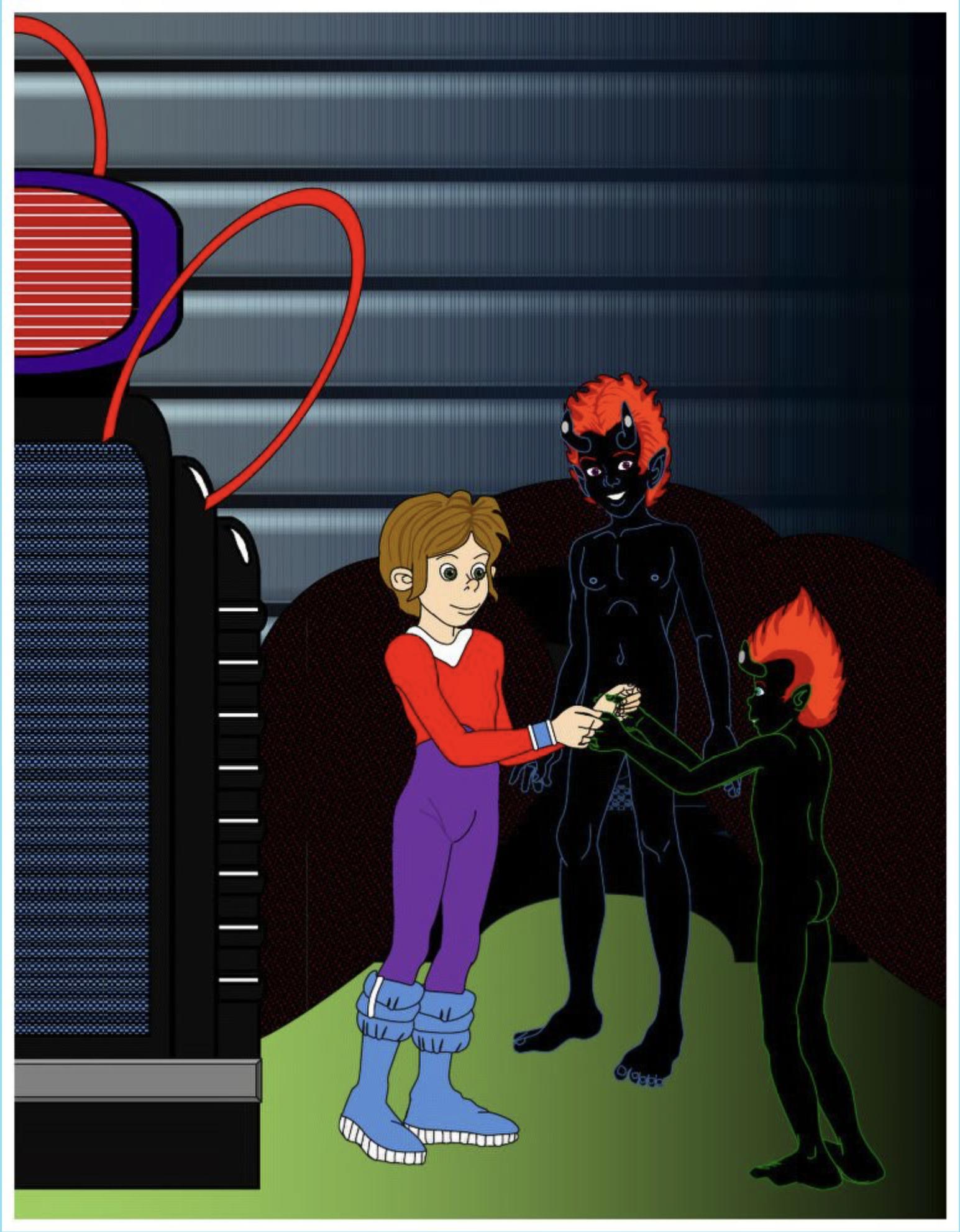 “You aren't going to leave us?” Martin suddenly piped up, anxiously. Everyone looked at him as he stood and walked over to Jahv and Toben, his hands out in an almost pleading gesture. “I don't want you to go! I'd rather go with you, even if you're going into space again.” Martinseemed to have suddenly overcome his fear of space travel, although he also seemed to have the wrong idea of what the aliens were planning.