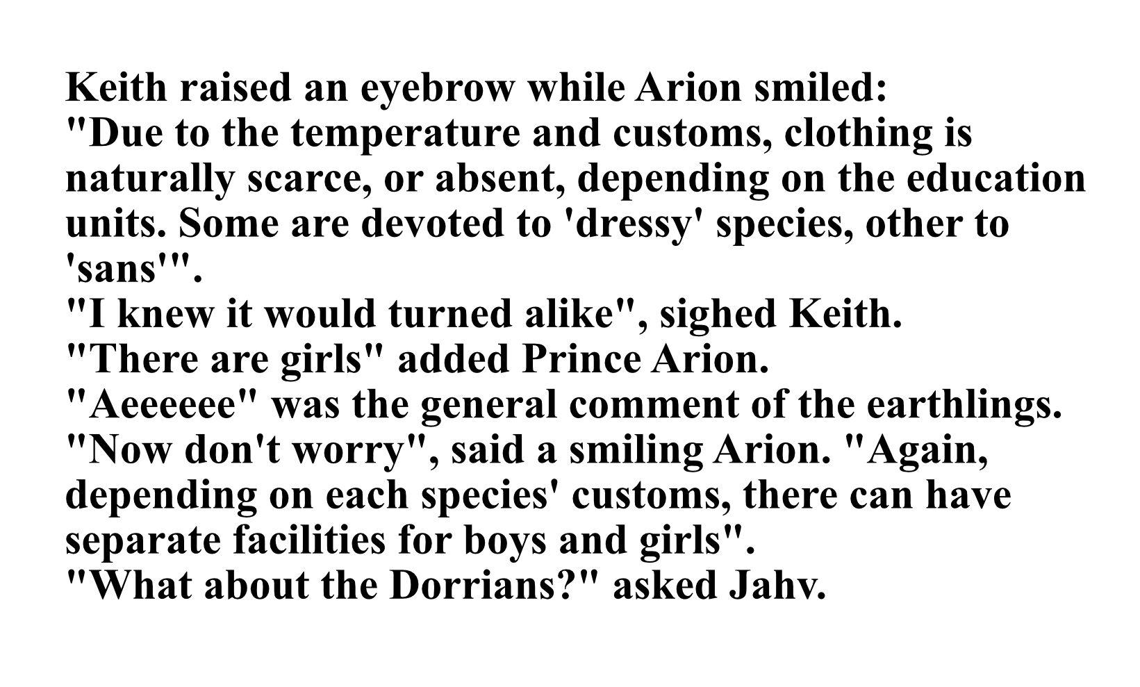 "Now don't worry", said a smiling Arion. "Again, depending on each species' customs, there can have separate facilities for boys and girls".