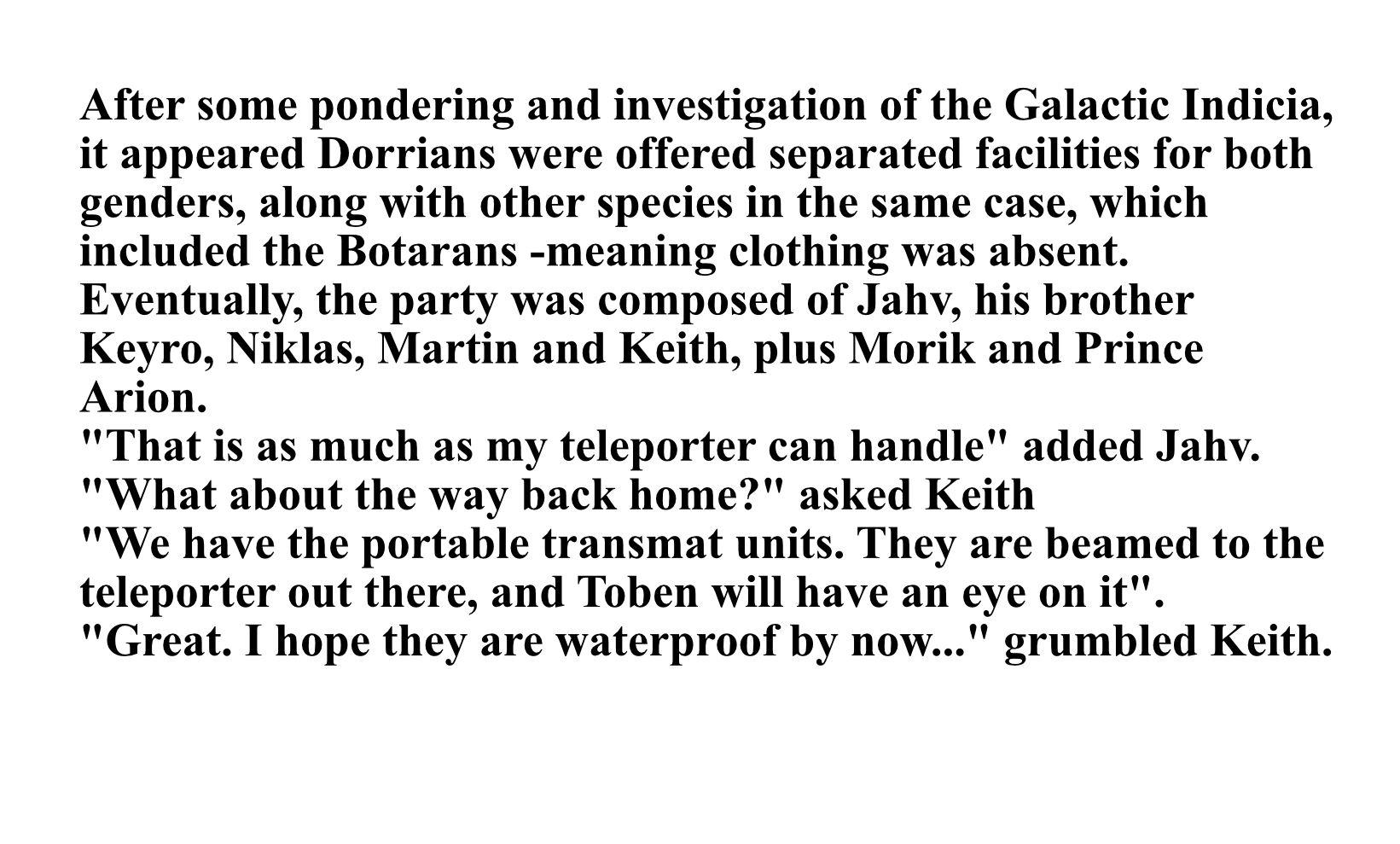 After some pondering and investigation of the Galactic Indicia, it appeared Dorrians were offered separated facilities for both genders, along with other species in the same case, which included the Botarans -meaning clothing was absent.