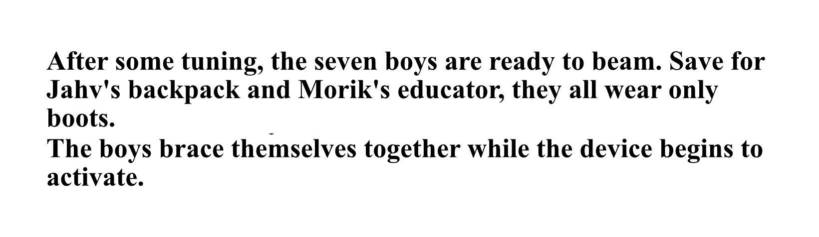 After some tuning, the seven boys are ready to beam. Save for Jahv's backpack and Morik's educator, they all wear only boots.