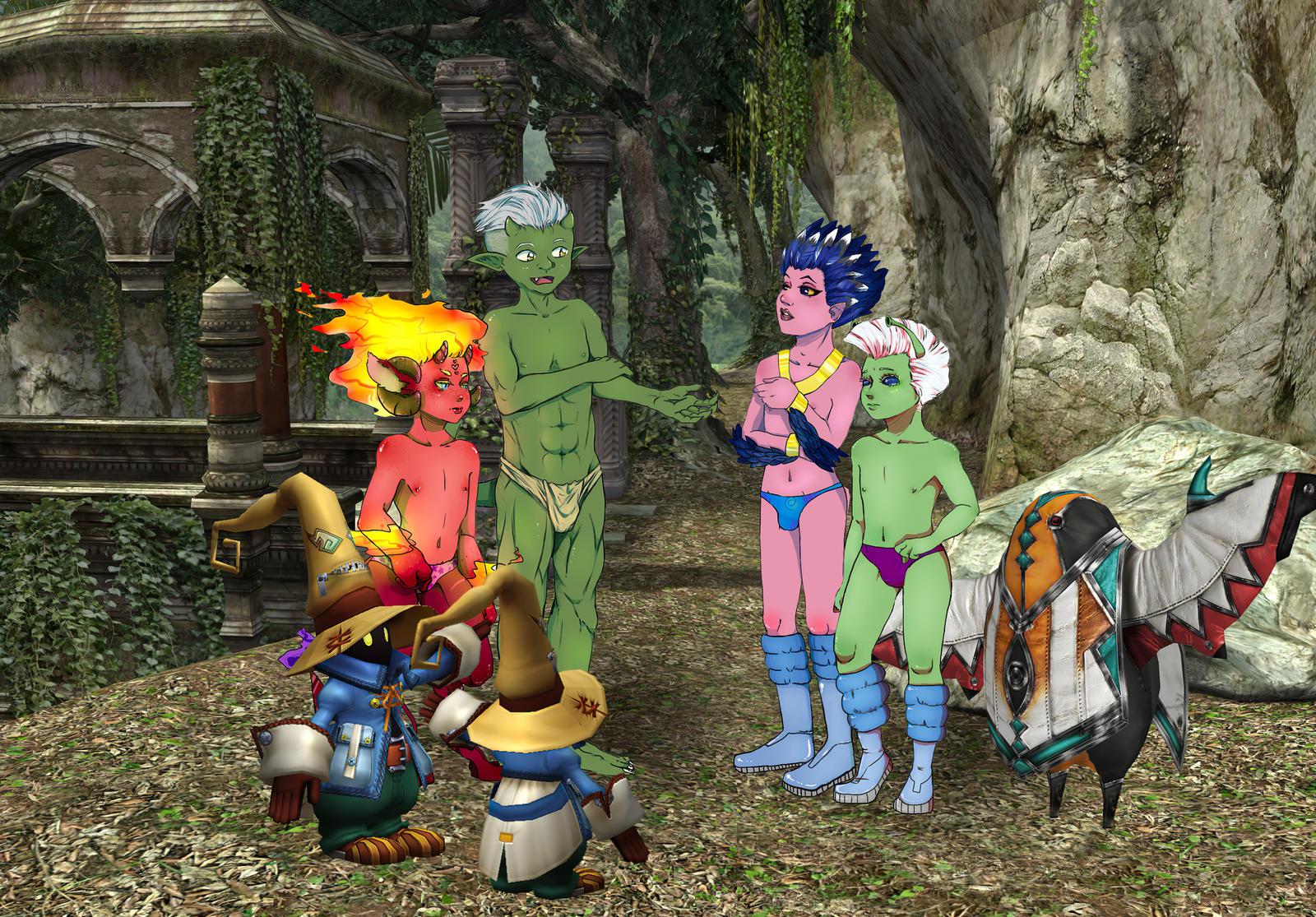 Background and small Aliens rendered in Poser. The green orc-boy by TheStripelessTiger, Flameboy by an artist I lost track of ![]()