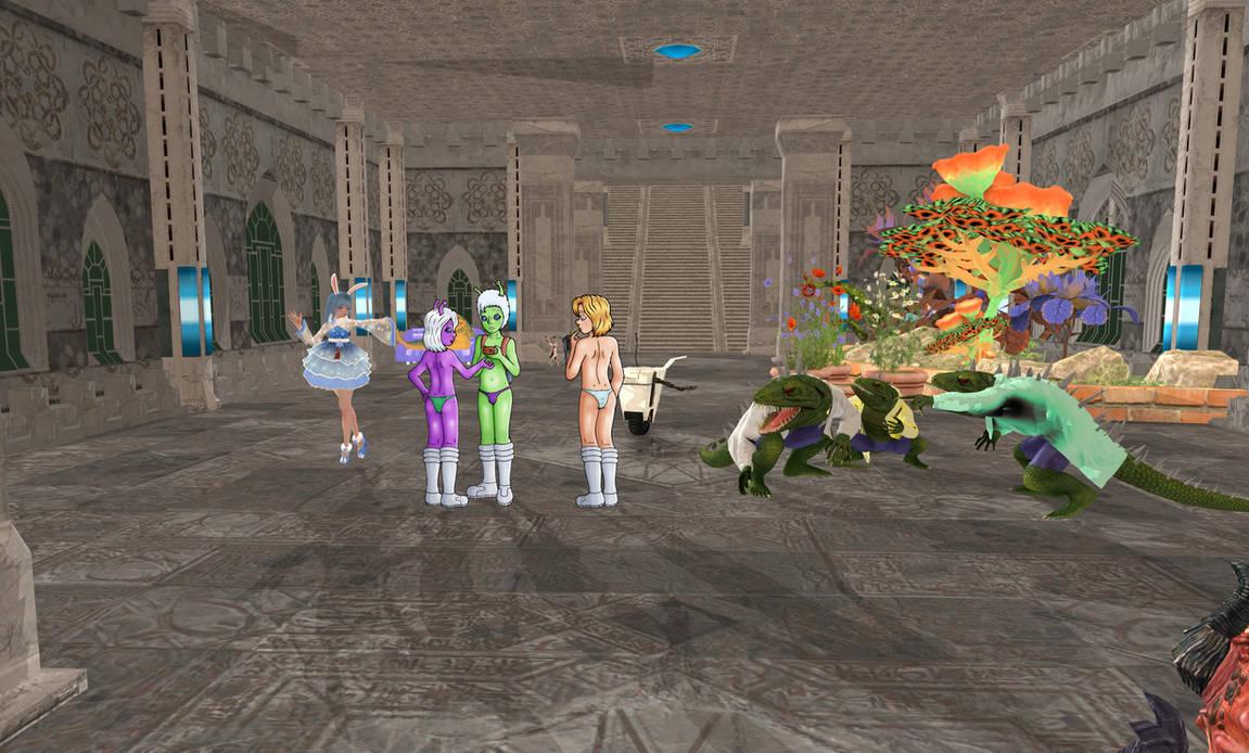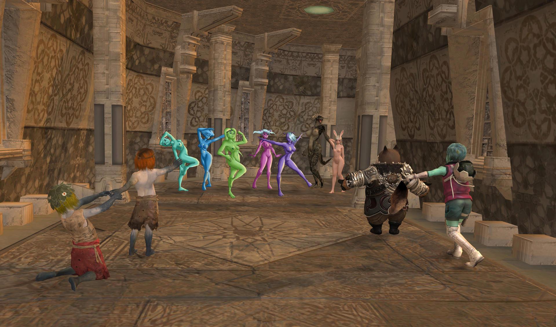 The end of the hall and the beginning of the stairs showed a number of girls of various species, and they were dancing slowly and/or singing in what seemed a dim sunlight coming from behind the right corner of the hall.